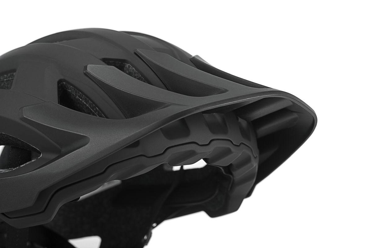MTB Trail-Helm, zusätzlicher Schutz im Bereich des Hinterkopfes durch tiefgezogene Heckpartie, 18 große Belüftungsöffnungen, optimierte Ventilationskanäle, abnehmbares Visier, einhändig bedienbares und höhenverstellbares SILC 180 Fit System für eine optimale Passform, Double-In-Mould Konstruktion, Flat Divider für die bestmögliche Gurtbandführung, X-Lock Befestigungssystem, herausnehmbare und waschbare Polster, Rastersteckschloss mit Kinnpolster, Natural Fit Konzept, mattes Finish