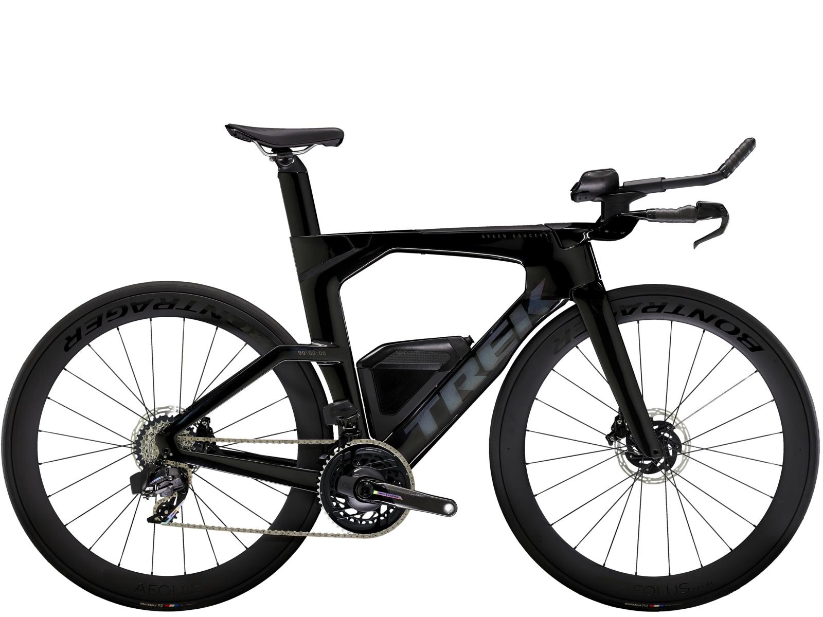 Einen ultraleichten Rahmen aus 800 Series OCLV Carbon, windschnittige Rohre mit Kammtail Virtual Foil-Profil (KVF), eine Speed Concept-Carbongabel mit aerodynamischem Profil, vibrationsdämpfendes IsoSpeed, integrierte Aufbewahrungslösungen für Verpflegung, Flüssigkeit und Pannenkit, einen drahtlosen, elektronischen SRAM Force AXS D2 12fach-Antrieb mit SRAM AXS Clics-Schalthebeln, einen SRAM Force AXS-Powermeter, einen vollständig integrierten Lenker samt Vorbau, einen triathlonspezifischen Bontrager Hilo Comp-Sattel für eine aggressive Aero-Sitzposition, Scheibenbremsen für zuverlässige Bremsleistung und Bontrager Aeolus Pro 51-