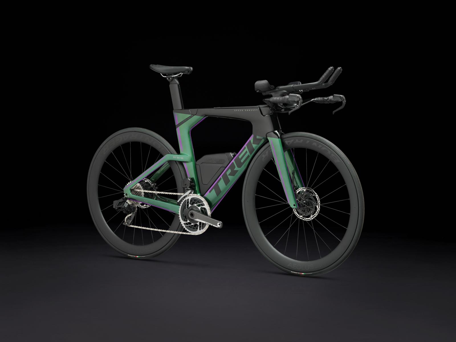Einen ultraleichten Rahmen aus 800 Series OCLV Carbon, windschnittige Rohre mit Kammtail Virtual Foil Profil (KVF), eine Speed Concept Carbongabel mit aerodynamischem Profil, straßenglättendes IsoSpeed, integrierte Aufbewahrungslösungen für Verpflegung, Flüssigkeitsversorgung und Pannenkit, einen drahtlosen, elektronischen SRAM RED AXS 12fach-Antrieb der vorherigen Generation mit SRAM AXS Blips Schalthebeln, ein SRAM RED AXS Powermeter, eine integrierte Lenker/Vorbau-Einheit, einen triathlonspezifischen Bontrager Hilo Pro Carbonsattel, zuverlässige Scheibenbremsen und aerodynamische Bontrager Aeolus Pro 51 Laufräder aus OCLV Car