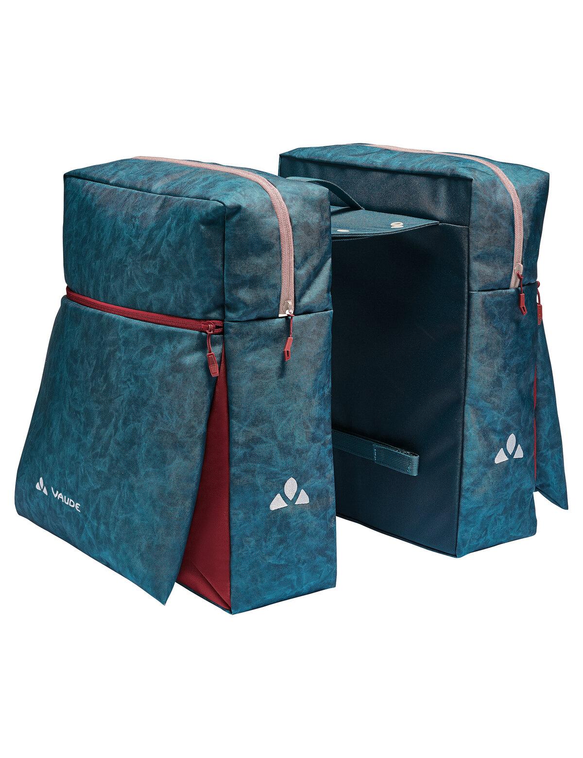 Die TwinZipper Doppeltasche macht den Fahrrad-Alltag bunt. Mit den farblich abgesetzten Reißverschlüssen und Schnittteilen sowie dem verspielten Druck auf dem Hauptmaterial bekommt diese Tasche den ganz besonderen urbanen Touch. Anbringen und Abnehmen sind mit wenigen Handgriffen erledigt. Der die beiden Taschen verbindende Steg wird einfach aufgelegt und über Klettbänder oben und seitlich unten am Gepäckträger befestigt. Er bietet mit 4 eingearbeiteten Ösen auch die Möglichkeit, eines der gängigen Befestitungssysteme (Uniklip, MIK, Snap-it, Snap-it II, I-Rack) nachzurüsten. Neben dem weit öffnenden, mit Reißverschluss versehenen Hauptfach bietet die TwinZipper eine aufgesetzte Reißverschluss-Fronttasche, die alles, was schnell zur Hand sein muss, sicher verstaut. Reflektierende Elemente und die mitgelieferten Regenhüllen der zu 100 % aus recyceltem Polyester bestehenden Doppeltasche sorgen für mehr Sichtbarkeit bei Dämmerung und Schlechtwetter. Das VAUDE Green Shape-Label steht für ein umweltfreundliches, funktionelles Produkt aus nachhaltigen und bluesign® zertifizierten Materialien. Als Mitglied mit Leader Status bei der unabhängigen Organisation Fair Wear engagiert sich VAUDE für faire Arbeitsbedingungen und faire Löhne.